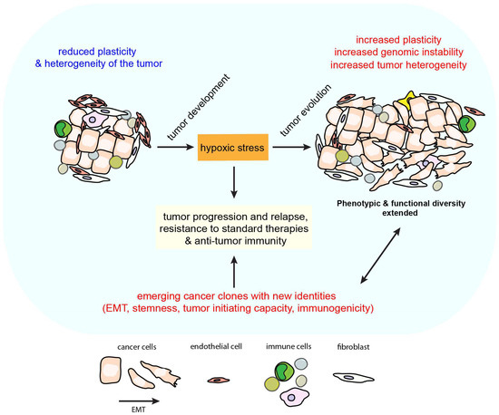 Tumors contain distinct cell types that collectively enable tumor growth and progression. Hypoxic stress can contribute by increasing cell plasticity, genomic instability and phenotypic heterogeneity of certain carcinoma cells, leading to intra-tumor heterogeneity and the emergence of cancer clones resistant to therapies and anti-tumor immunity.