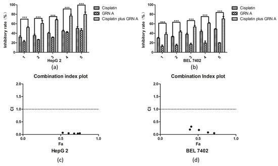 GRN A synergized with cisplatin to inhibit cancer cell proliferation. Cytotoxicity of GRN A, cisplatin, and the combination of the two drugs. HepG2 (a) and BEL7402 (b) cancer cells were plated on 96 plates. After an incubation for 48 h, cells were treated with certain concentrations of GRN A, cisplatin, and the combination of the two drugs. The inhibitory rate of the cell growth was analyzed by an MTS assay, as described in the materials and methods section. (c, d) Combination index (CI) Plot. A CI of GRN A and cisplatin was analyzed using the Chou-Talalay approach. CI values were plotted as a function of the fractional affection (Fa) from 0.39 to 0.85 in HepG2 and BEL7402 cells. CI > 1.3, antagonism; CI 1.1–1.3, moderate antagonism; CI 0.9–1.1, additive effect; CI 0.8–0.9, slight synergism; CI 0.6–0.8, moderate synergism; CI 0.4–0.6, synergism; CI < 0.4, strong synergism. (t-test, n ≥ 3 *** p < 0.001)