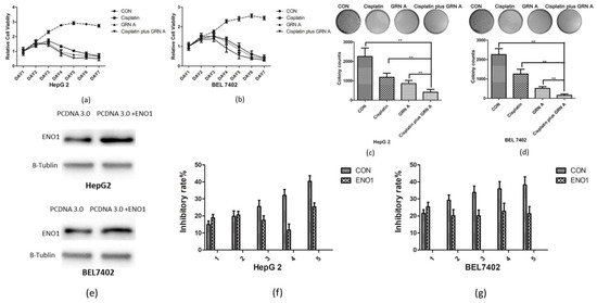 To investigate the effect of cisplatin, GRN A, and the combination of cisplatin with GRN A on the growth of HCC cells, cell viability and colony formation assays were performed. As shown in Figure 2a,b, cisplatin or GRN A alone inhibited HCC cell proliferation. Moreover, the combination of cisplatin and GRN A displayed more potent suppressed effect on the proliferation of HCC cells in a time-dependent manner. A colony formation assay revealed that the combination of cisplatin and GRN A exhibited a more obvious inhibitory effect on the colony formation than using cisplatin alone; the colony number was 1185 ± 104 in cells treated with cisplatin alone, while the number reduced to 414 ± 39 in cells treated with the combination of the two drugs in HepG2 cells. Similar results were also found in BEL7402 cells treated with the combination of GRN A and cisplatin (Figure 2c,d). These results suggest that the combined application of GRN A and cisplatin displayed more obvious inhibitory effect of colony formation in HCC cells. In order to evaluate whether synergistic effect is associated with the ENO1 expression, we constructed ENO1 overexpression cells (Figure 2e). Our results showed that the inhibitory effect of cancer cells growth was diminished significantly in cells with an overexpression of ENO1 in both BEL7402 and HepG2 cells, compared with that in the parent cells (Figure 2g,f). These results suggest that the synergistic effect of GRN A and cisplatin can be attributed to the inhibiting of ENO1 by GRN A.