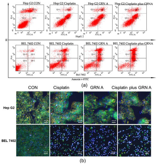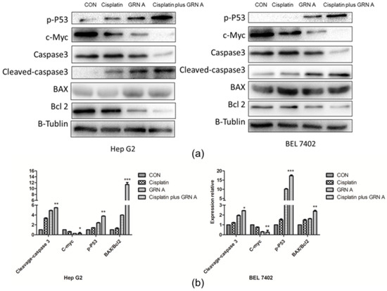 The induced apoptosis of GRN A, cisplatin, and the combination of the two drugs was investigated by flow cytometry, mitochondrial membrane potential, and western blot in HepG2 and BEL7402. Both of the HepG2 and BEL7402 cells were treated with cisplatin (33.33 µM), GRN A (14.57 µM), and their combination for 24 h. After double staining with recombinant annexin V conjugated to green-fluorescent FITC dye (Annexin V FITC) and propidium iodide (PI), a flow cytometry analysis was performed. As shown in Figure 3a, the apoptotic rate is 48.35 ± 2.24%, 49.20 ± 2.74%, and 56.44 ± 5.77%, respectively, in HepG2 cells treated with cisplatin, GRN A, and the combination of the two drugs. Similar results were also found in BEL7402 cells treated with cisplatin, GRN A, and the combination of the two drugs. The change of MMP was also analyzed using a MITO-ID fluorescent probe staining approach. As shown in Figure 3b, the cells treated with the combination of GRN A and cisplatin displayed more obvious change of MMP compared to cells treated with GRN A and cisplatin alone; the orange color nearly disappeared when treated with the combination of the two drugs. Additionally, the western blot analysis revealed that co-treatment with cisplatin and GRN A increased the expression of phosphorylated p53, cleavage caspase 3, as well as the ratio of BAX/Bcl2, and down-regulated the expression of c-Myc in both HepG2 and BEL7402 cells. Moreover, the combined treatment potentiated the effect significantly (Figure 4a,b). These results indicated that the combination of GRN A and cisplatin increased the apoptotic effect in HCC cells.
