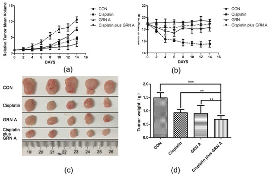 The animal experimental protocol was approved on 07 May 2018 by the Committee of Animal Experiments and Experimental Animal Welfare of Capital Medical University, protocol number AEEI-2018-081. Hepatocellular carcinoma cancer HepG2 cells (1 × 107) were subcutaneously injected to the flanks of 6–8 weeks old female nude BALB/c mice. The mice were randomly divided into 4 groups; each group contained 5 mice. The control group was administrated through IP with saline containing 10% dimethyl sulfoxide (DMSO), while the cisplatin group was treated with cisplatin (5 mg/kg), and the GRN A group was treated with GRN A (50 mg/kg). The combination treated group was administrated with both cisplatin (5 mg/kg) and GRN A (50 mg/kg). All of the mice were recorded for 14 days. The tumor diameters were periodically measured with a caliper every two days. The volumes were calculated according to the following formula: Tumor Volume (mm3) = length × (width)2/2. No mice died of tumor loading in the experiments.