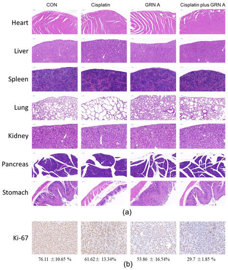 In order to further evaluate the toxicity of the combination of GRN A and cisplatin on nude mice, hematoxylin and eosin (H&E) staining and immunohistochemistry (IHC) immunologic analysis were performed. As shown in Figure 6a, there is no obvious lesson in the main organs of mice treated with saline or GRN A. However, treated with cisplatin resulted in systematic toxicity in the tissue of lung, stomach, and kidney. Interestingly, no obvious lessons were found in the main organs of mice treated with the combination of cisplatin and GRN A. IHC immunological analysis also revealed that GRN A could sensitize the tumor to cisplatin; the brown particle presented the cellular proliferation marker (Ki-67) expression, as shown in the Figure 6b, and the manual counting data for Ki-67 was performed as described by Yeo, M.K., et al. [28]. IHC staining showed that the positive ratios of the Ki-67 protein in the cisplatin plus the GRN A group were 29.7 ± 1.85%, which is less than the control (76.11 ± 10.65%), cisplatin (61.62 ± 13.34%), and GRN A (53.86 ± 16.54%) groups (P = 0.003 and P = 0.002, respectively). (t-test, ** p < 0.01)
