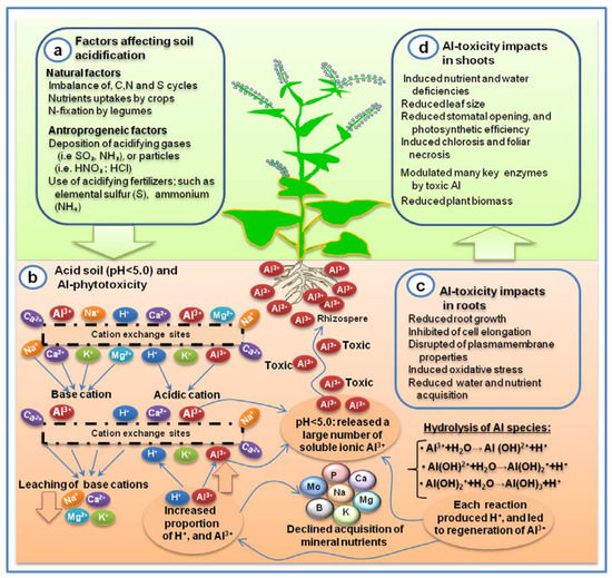 General overview of the factors affecting soil acidification, subsequent Al toxicity, and impacts in plants. (a) Natural and anthropogenic sources for occurring soil acidification. (b) Impact of cation saturation ratio in soil that led to increased exchangeable Al3+, and reduce acquisition of mineral nutrients. (c) Consequence of Al toxicity in roots, and thereby (d) impact of Al toxicity in shoots.