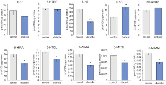The content (per 100 μg of protein) of melatonin synthesis-related indoles in the pineal glands of control and diabetic pigs. The means significantly different from those of the control group are marked with asterisks; single asterisk (*) indicates p < 0.05, double asterisk (**) represents p < 0.01. Abbreviations: TRP, tryptophan; 5-HTRP, 5-hydroxytryptophan; 5-HT, serotonin; NAS, N-acetylserotonin; 5-HIAA, 5-hydroxyindole acetic acid; 5-HTOL, 5-hydroxytryptophol; 5-MIAA, 5-methoxyindole acetic acid; 5-MTOL, 5-methoxytryptophol; 5-MTAM, 5-methoxytryptamine.