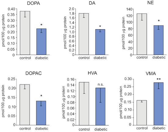 The content (per 100 μg of protein) of catecholamines and their metabolites in the pineal glands of control and diabetic pigs. The values presented are means and standard errors (n = 5). The means significantly different from those of the control group are marked with asterisks; single asterisk (*) indicates p < 0.05, double asterisk (**) represents p < 0.01, n.s. indicates non-significant. Abbreviations: DOPA, 3,4-dihydroxyphenylalanine; DA, dopamine; NE, norepinephrine; DOPAC, 3,4-dihydroxyphenylacetic acid; VMA, vanillylmandelic acid; HVA, homovanillic acid.