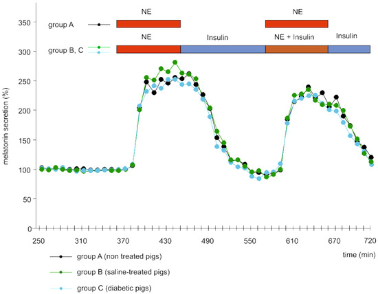 The experiment was performed on three groups of explants. Group A comprised the pineal explants prepared from normal, untreated pigs; group B—the pineal explants of saline-treated, control pigs; and group C—the pineal explants of streptozotocin-treated, diabetic pigs. After 6 h of incubation in the superfusion culture, the explants from all groups were stimulated with 10 μM NE for 90 min. Then, the explants of groups B and C were treated with 10 µM insulin for 120 min, stimulated with 10 µM NE for 90 min in the presence of insulin (10 µM), and again incubated in the medium with insulin. At the same time, the explants from group A were incubated and stimulated with NE in the medium without insulin.