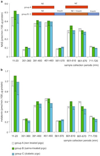 The changes in melatonin secretion from the pineal glands of control and diabetic pigs in response to adrenergic stimulation and insulin treatment were determined by measurement of the hormone concentration using radioimmunoassay (RIA) in all samples collected during the superfusion culture (Section 2.2.1, Figure 3). In view of the fact that the results of our in vivo study showed significant differences in the level of NAS between the pineal glands of diabetic and non-diabetic pigs, concentrations of NAS (and simultaneously melatonin) were determined in selected medium samples by high pressure liquid chromatography technique (HPLC) and presented in Section 2.2.2 (Figure 4).