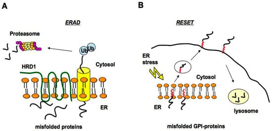 - Satpute-Krishnan, P.; Ajinkya, M.; Bhat, S.; Itakura, E.; Hegde, R.S.; Lippincott-Schwartz, J. ER stress-induced clearance of misfolded GPI-anchored proteins via the secretory pathway. Cell 2014, 158, 522–533. [Google Scholar] [CrossRef] [PubMed]