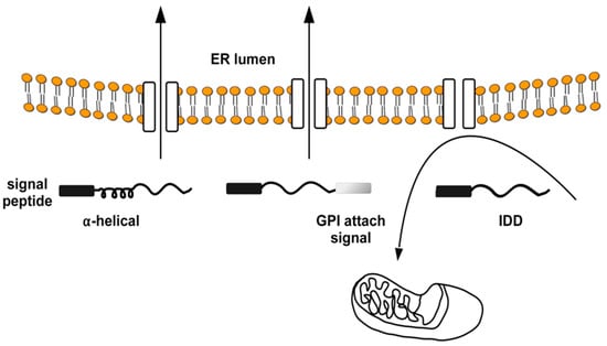 - Pfeiffer, N.V.; Dirndorfer, D.; Lang, S.; Resenberger, U.K.; Restelli, L.M.; Hemion, C.; Miesbauer, M.; Frank, S.; Neutzner, A.; Zimmermann, R.; et al. Structural features within the nascent chain regulate alternative targeting of secretory proteins to mitochondria. EMBO J. 2013, 32, 1036–1051. [Google Scholar] [CrossRef] [PubMed]