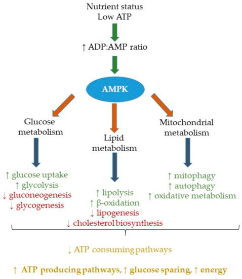 The role of AMP-Activated Protein Kinase (AMPK) on whole-body metabolism. AMPK is a nutrient sensor, which is activated in response to low adenosine triphosphate (ATP) levels, and an increased adenosine diphosphate: adenosine monophosphate (ADP:AMP) ratio. As a result, it activates pathways that produce ATP through glucose, lipid and mitochondrial metabolism pathways, thus increasing ATP levels. Conversely, pathways that deplete ATP are inhibited by AMPK. An ↑ arrow represents an upregulation of the process and ↓ represents a downregulation of the process. AMPK = AMP-Activated Protein Kinase, ATP = Adenosine triphosphate, ADP = Adenosine diphosphate, AMP = Adenosine monophosphate.