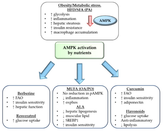 Whole body AMPK modulation and the impact of different nutrients on AMPK activation. Excess nutrient consumption through high fat diet (HFD) and obesity can downregulate AMP-Activated Protein Kinase (AMPK) expression and cause dysregulated metabolism, inflammation and insulin resistance. Nutrients, including monounsaturated fatty acids (MUFA), α linoleic acid (ALA), berberine, resveratrol, curcumin and flavonoids can all activate AMPK and downstream positive effects in relation to improved mitochondrial metabolism, improved liver function and reduced inflammation. Therefore, modulation of AMPK through nutrient intervention can improve whole body metabolism. An ↑ arrow represents an upregulation of the process or increased expression and ↓ represents a downregulation of the process or decreased expression. AMPK = AMP-Activated Protein Kinase, MUFA = Monounsaturated fatty acids, OA = Oleic acid, PO = Palmitoleic acid, ALA = α linoleic acid, SREBP1 = Sterol regulatory element-binding protein 1c, FAO = fatty acid oxidation.