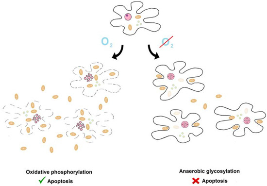 Aerobic respiration takes place in the mitochondria. Indeed, mitochondria are key players in animal apoptosis and are involved in different apoptotic initiation pathways. For example, apoptosis is initiated by mitochondrial permeability transition, regulated by BCL-2 type proteins [70,87,88,89]. It induces the release of cytochrome c [90]. Cytochrome c is part of the oxidative chain and is also an apoptotic factor [85]. Released cytochrome c induces the proteolytic activity of caspase, which is the main animal apoptotic protease [7]. The mechanism of this activation has been well described. Cytochrome c is also part of a multiprotein apoptosis-activating complex called the apoptosome [7]. There are many other mitochondrial apoptotic factors, such as EndoG nuclease, OMI/HTRA proteases, apoptotic induction factors, and some caspases [29].