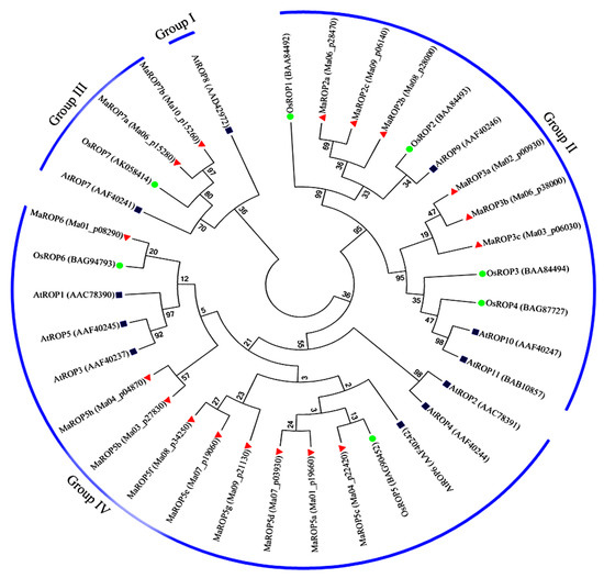 Phylogenetic analysis of Rho-like GTPases from plants (ROPs) from A. thaliana, rice, and bananas. The maximum-likelihood phylogenetic tree was drawn with MEGA5.2, using 1000 bootstraps. Four subgroups were identified (Groups I–IV). Circles, squares, and triangles represent ROP proteins from rice, A. thaliana, and bananas, respectively.