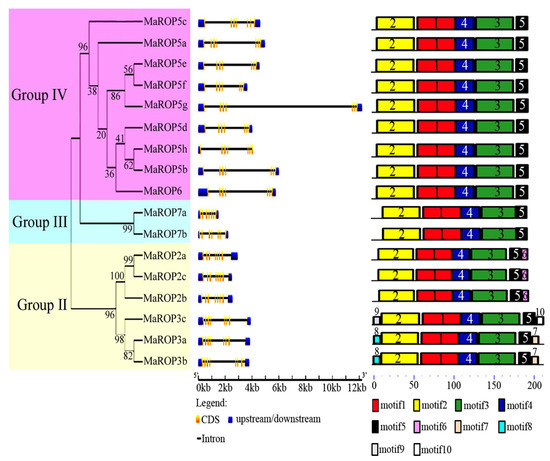 Evolutionary analysis supported the classification of the 17 MaROP genes into three distinct groups (Groups II–IV), which is consistent with their exon–intron structural divergence within families (Figure 2). Our analysis of the exon–intron structure using the Gene Structure Display Server showed that the MaROP genes contained 8 exons in Group II, 7 exons in Group III, and 6–7 exons in Group IV, suggesting the conservation of the exon–intron structures of MaROPs within the same group.