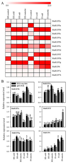 Bananas are extremely sensitive to abiotic stress and can suffer severe losses in yield and quality when exposed to cold, salt, or drought conditions [36]. We found that 82% of the 17 MaROPs showed transcriptional changes following cold, salt, and osmotic stress treatments (Figure 3). Interestingly, except the high expression genes (MaROP-3b, -5a, -5c, -5f, -5g, and -6) under three stress treatments, MaROP-3a and -5h are significantly downregulated in the presence of stress in BX and FJ compared to control. To our knowledge, this is the first report showing that banana MaROPs exhibit extensive and diverse responses to abiotic stressors. The induction of ROP expression by cold, salt, and drought has previously been reported in other plants, such as Malus× domestica Borkh [21], A. thaliana [22], and N. tabacum [23].