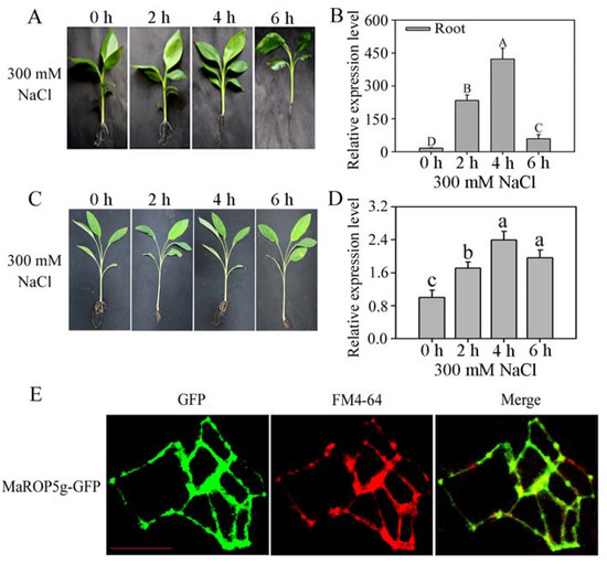 MaROP5g expression analyses in both banana varieties roots after different periods of exposure to salt stress and subcellular localization. (A) Phenotypes of BX roots exposed to salt stress; (B) expression of MaROP5g in BX roots exposed to salt stress; (C) phenotypes of FJ roots exposed to salt stress; (D) expression of MaROP5g in FJ roots exposed to salt stress. Data are presented as means ± standard deviations of n = 3 biological replicates. Different lowercase letters above bars indicate significant differences at p < 0.05, and different uppercase letters above bars indicate extremely significant differences at p < 0.01, using Duncan’s multiple range tests. (E) MaROP5g subcellular localization. GFP fluorescence is green, and FM4-64 is red. Merge was created by merging the GFP and FM4-64 fluorescent images. Scale bars = 10 μm.