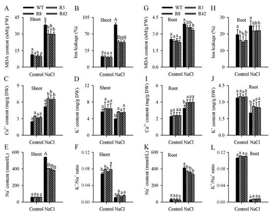 Physiological analyses and ion concentration in roots from wild-type and A. thaliana overexpressing MaROP5g. (A–F) Malonaldehyde content, ion leakage, Ca2+ concentration, K+ concentration, Na+ ion concentration, and K+/Na+ ratio of wild-type and transgenic shoots under normal conditions and salt treatment. (G–L) Malonaldehyde content, ion leakage, Ca2+ concentration, K+ concentration, Na+ ion concentration, and K+/Na+ ratio of wild-type and transgenic roots under normal conditions and salt treatment. WT: Wild-type. R3, R8, R42: MaROP5g transgenic plants. ANOVA was used to compare the significance of differences, using Student’s t tests in the comparison between control and NaCl treatment. Data are presented as means ± standard deviations of n = 3 biological replicates. Different lowercase letters above bars indicate significant differences at p < 0.05, and different uppercase letters above bars indicate extremely significant differences at p < 0.01.