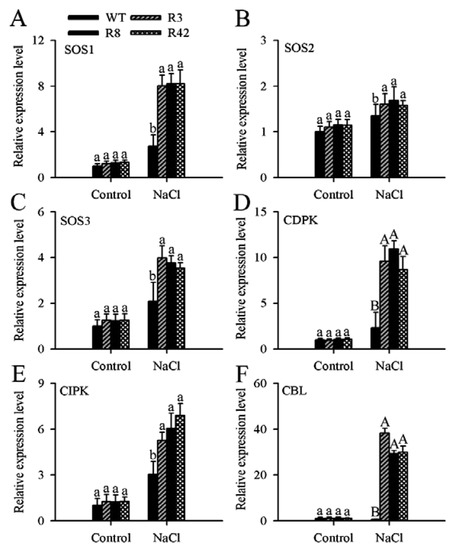 To gain an in-depth understanding of MaROP5g function in response to salt stress, we measured the expression of three Salt Overly Sensitive (SOS)-pathway genes (namely SOS1, SOS2, and SOS3) and several genes encoding calcium-signaling pathway proteins, including calcineurin B-like (CBL) proteins, CBL-interacting protein kinases (CIPKs), and calcium-dependent protein kinases (CDPKs) [39], in both WT and MaROP5g-overexpressing A. thaliana (Figure 7). Under standard growth conditions, we observed no significant differences in the transcription levels of the tested genes in the transgenic lines as compared to those in WT plants. However, under salt stress, the gene expression levels of SOS1, SOS2, SOS3, CBL, CIPK, and CDPK were higher in the transgenic lines as compared to those in WT. This indicated that MaROP5g overexpression in response to salt stress led to the up-regulation of both SOS-pathway genes and calcium-signaling pathway genes.