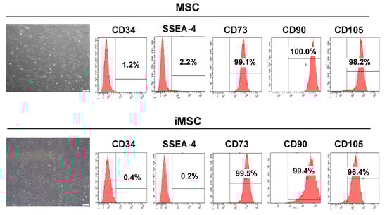Comparison of the morphology and cell surface marker profile between human Wharton’s jelly MSCs and iMSCs. Both types of cells showed a typical morphology of MSC, with spindle- or fibroblast-like appearance. Flow cytometry analysis showed that both types of cells were positive for MSC markers CD73, CD90, and CD105, but negative for CD34 and SSEA-4. Scale bars are 200 µm.