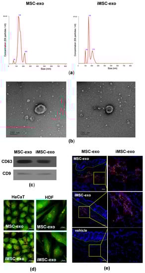 Characterization of exosomes derived from MSCs and iMSCs. (a) Nanoparticle analysis of MSC-exo and iMSC-exo. The mean diameter was 167 and 147 nm for MSC-exo and iMSC-exo, respectively. (b) TEM analysis of exosomes. Scale bars are 200 nm. (c) Immunoblotting for CD63 and CD9 in exosomes. (d) Verification of the uptake of exosomes in skin cells. MSC-exo or iMSC-exo (20 µg/mL) were stained with PKH26® (red) and incubated with HaCaT and HDFs for 24 h. Before analysis, cells were counterstained with CellTracker® (green). Scale bars are 20 µm. (e) Confocal images of mouse skin tissues treated with MSC-exo or iMSC-exo. A total of 30 µg of PKH26-labeled (red) exosomes were injected into the dorsal skin and tissues were collected after 24 h. Saline (vehicle) was used as negative control. Nuclei were stained with DAPI (blue) for counterstaining. Green dotted lines delineate epidermal-dermal junction. Scale bars are 200 µm.