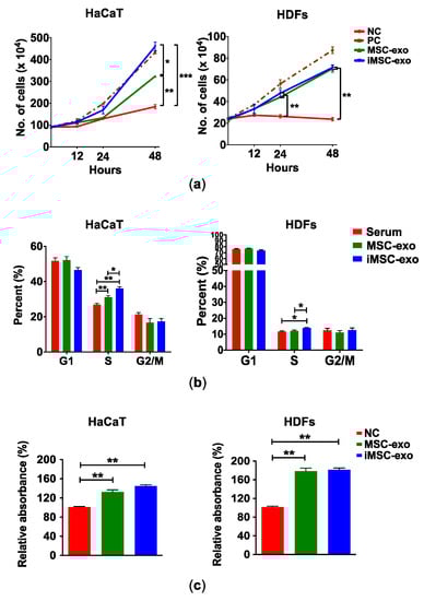 For functional analysis, we investigated whether iMSC-exo stimulate the growth of HaCaT and HDFs. As shown in Figure 3a, MSC-exo and iMSC-exo stimulated the growth of HaCaT and HDFs. Interestingly, iMSC-exo enhanced the growth rate of HaCaT, as compared with MSC-exo at 48 h (p = 0.0104), while no difference was found in the effect of MSC-exo and iMSC-exo on HDFs. Based on these results, we conducted cell cycle analysis to confirm the proliferative role of exosomes. Figure 3b shows that treatment of HaCaT with MSC-exo and iMSC-exo significantly increased the number cells in S phase as compared with cells cultured in serum-supplemented medium (p < 0.01). More HaCaT cells were detected in S phase following treatment with iMSC-exo than with MSC-exo (p < 0.05). Similarly, iMSC-exo treatment led to an increase in the number of HDFs in S phase, as compared with treatment with serum-supplemented medium or MSC-exo. The results of 3-(4,5-dimethylthiazol-2-yl)-2,5-diphenyltetrazolium bromide (MTT) assay revealed that the treatment of cells with MSC-exo or iMSC-exo resulted in a significant increase in the proliferation of HaCaT and HDFs (Figure 3c).