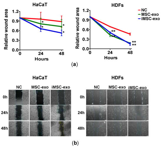 Wound scratch assay revealed that treatment with both MSC-exo and iMSC-exo significantly reduced the wound area, as compared with negative control (serum-free culture) treatment at 24 and 48 h in HaCaT and HDFs (Figure 4).