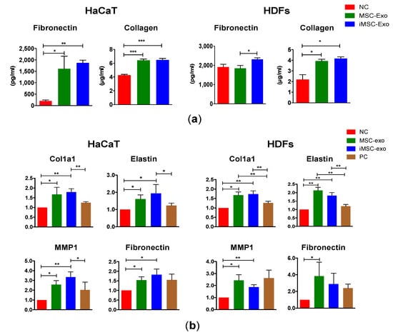 Comparison of the relative soluble protein and mRNA expression following exosome treatment. (a) A total of 20 µg/mL of MSC-exo or iMSC-exo were incubated with HaCaT and HDFs for 48 h, and the concentration of fibronectin and collagen was measured using a Human Magnetic Luminex® Screening Assay and SirCol assay kits, respectively. (b) Exosome-treated HaCaT and HDFs were subjected to qRT-PCR analysis and the expression of each gene was normalized against the expression detected in the non-treated negative control (NC). Cells cultured with serum (10%) were used as positive control (PC). Negative control (NC) was cells cultured without serum. All data are expressed as mean ± standard deviation (SD) from three replicates. * p < 0.05, ** p < 0.01, *** p < 0.005.