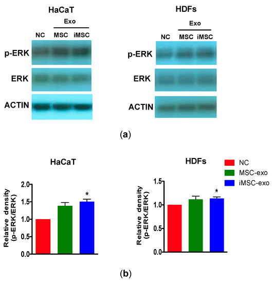 Immunoblotting for the detection of phosphorylated ERK1/2 in HaCaT and HDFs. (a) Cells were cultured with MSC-exo or iMSC-exo for 1 h and then the cell extracts were analyzed by immunoblotting for total ERK1/2 and phosphorylated ERK1/2 (Thr202/Tyr204). Beta-actin was used as the loading control. NC and PC are cells cultured without and with serum, respectively. (b) Densitometric analysis of the relative level of phosphorylated ERK1/2 (Thr202/Tyr204) against their total levels in HaCaT and HDFs. The value was normalized against that observed for negative control (NC, no serum). All data are expressed as mean ± standard deviation (SD) from three replicates. * p < 0.05 against NC. HDFs indicate human postnatal dermal fibroblasts.