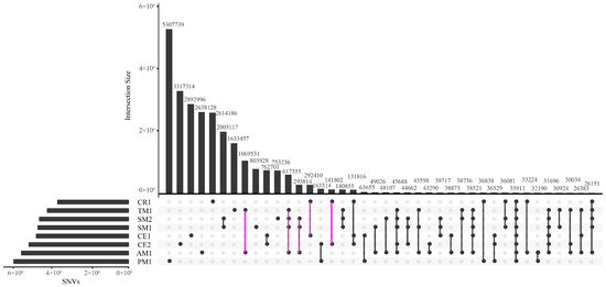 UpSetR plot illustrating the numbers of SNVs shared by different pairs or sets of macaques. Only the first twenty sets are displayed. Intersection Size on the y-axis represents the number of shared SNVs in the pair or set of macaques showed on x-axis.