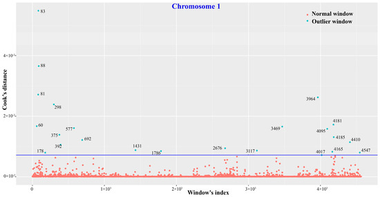 Outlier test of nonsynonymous SNV distribution patterns on chromosome 1 for eight macaque individuals using Cook’s distance test in R. The blue circles represent outlier chromosomal bins that hold significantly more nsSNVs than others. In addition, the numbers next to the blue circles are Cook’s distances of the outlier bins. The dark blue line shows the threshold we used that is 30 times of the mean Cook’s distance.