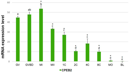 Expression of CPEB2 mRNA during oocyte maturation and early embryonic development. The relative abundance CPEB2 mRNA was determined by qRT-PCR in porcine oocytes and parthenogenetic early embryos including GV, GVBD, MI, and MII oocytes, pronuclear (1C), two-cell (2C), four-cell (4C), eight-cell (8C), morula (MO), and blastocyst (BL) embryos. CPEB2 transcript levels were normalized relative to the abundance of GAPDH mRNA (exogenous control) and are shown as means ± SEM (n = 4 independent biological experiments). Different letters indicate statistical difference (p < 0.05), * indicates statistical difference compared to the mRNA level in the GV stage (p < 0.05).