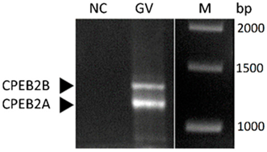 Two splice variants of CPEB2 transcript in porcine oocytes. CPEB2A (short variant) and CPEB2B (long variant) were detected using RT-PCR. GV = oocyte stage, NC = negative control, M = marker, bp = marker size. The experiment was repeated three times, with 280 oocytes per experiment.