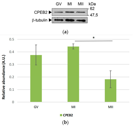 To investigate the CPEB2 protein expression in porcine oocytes, we used Western blotting with the antibody directed towards the N-terminal region of CPEB2. Regarding the two splice variants, the antibody used for this experiment does not discriminate between CPEB2A and 2B. We detected only one band of approx. 50 kDa in all stages of the meiotic maturation (Figure 3a and Figure S2) with a maximum abundance in the MI stage. The protein remained present until metaphase II, when its expression decreased significantly (Figure 3b).