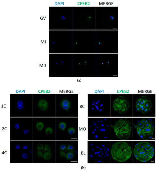 Before staining, the oocytes and embryos were treated for 5–10 s with acidic Tyrode’s solution (T1788) to remove zona pellucida. They were then fixed for 30 min in 3.7% paraformaldehyde. Next, they were washed three times in PVA-PBS and permeabilized with PVA-PBS containing 0.5% Triton X-100 for 30 min. For the following washes, washing solution (0.1% Triton X-100 + 0.01% Tween 20 in PBS) was used three times for 5 min. The oocytes and embryos were blocked in 1% BSA in PBS for 1 h and then incubated overnight at 4 °C in the same solution with the addition of the anti-CPEB2 antibody (dilution 1:50, sc-55622, Santa Cruz, Dallas, TX, USA). In the next step, the oocytes were washed with washing solution for 5 min and then treated with goat anti-rabbit secondary antibody (1% BSA in PBS containing Alexa-Fluor-488, dilution 1:200) for 1.5 h. After washing in washing solution, oocytes and embryos were incubated with 10 mg/mL DAPI in PVA-PBS for 10 min in the dark, washed three times in PVA-PBS, and mounted onto glass slides with mounting media Vectashield (94010, Vector Laboratories, Burlingame, CA, USA) and examined using a confocal microscope (Zeiss LSM 710 META, Jena, Germany). Images were processed using Zen software (version 8.0, Zeiss, Jena, Germany).