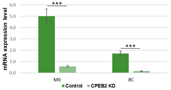 To evaluate the effect of CPEB2 KD on meiotic maturation and early embryogenesis, MII oocyte and embryo developmental rates were examined. The percentage of MII oocytes in the CPEB2 KD group (43%) was significantly lower (p < 0.001) than that in the control group (92%, Figure 8a). At the beginning of embryogenesis there were no significant differences between the control groups and the CPEB2 KD groups. In the two-cell stage, 88% (control) vs. 85% (KD) developed embryos were observed. However, during the four-cell stage the rate was 75% vs. 68% developed embryos, in the eight-cell stage the rate was 65% vs. 45%, and in the morula stage the rate was 54% vs. 28%, with all differences being statistically significant (p < 0.001). In the blastocyst stage, we also observed significant differences (p < 0.01) between the control group (40%) and the KD group (15%, Figure 8b).