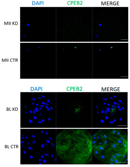 Efficiency of CPEB2 KD during oocyte maturation and embryonic development at the protein level. Representative confocal images show the immunocytochemical detection of CPEB2 (green) protein in porcine MII oocytes and blastocyst (BL). DNA was stained with DAPI (blue). A minimum of 30 oocytes and embryos derived from four independent replicates were analyzed. Scale bars = 100 μm.