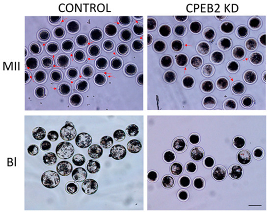 Morphological effect of CPEB2 KD. CPEB2 KD by dsRNA resulted in a decrease of the first polar body extrusion in MII phase porcine oocytes as well as a decrease in porcine parthenogenetic blastocyst formation and size (BL). The red arrows indicate the polar bodies. Scale bar = 200 μm.