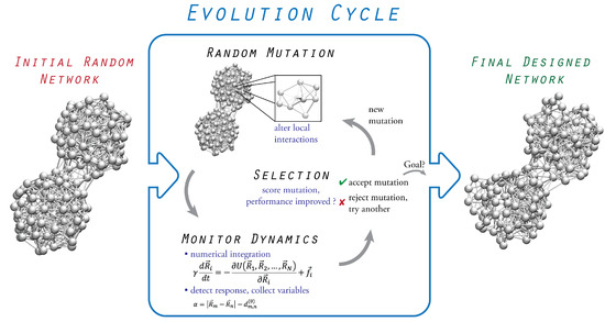 The design process relies on the evolution of initially inactive structures which alter their architecture and pattern of physical interactions to improve and eventually optimize their performance towards a prescribed functional task. The full evolution scheme is shown in Figure 1, and the involved steps are described in the following text.