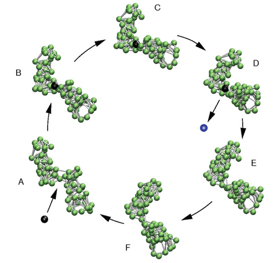 Model molecular machine. A single operation cycle is shown. In the open conformation (A), a substrate ligand bead can bind and trigger the soft hinge motion between the domains (B–D). In the conformation corresponding to the steady state of the network–ligand complex (D), the ligand becomes converted into the product, and after its release, motions which bring back the network to its initial free conformation take place (D–F and A). Figure taken from Reference [24] (slightly modified).