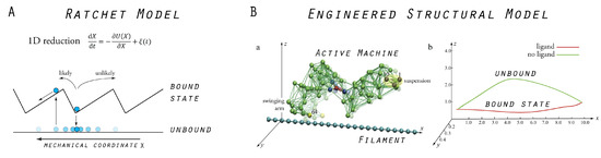 Models of molecular motors: (A) Traditional ratchet model in which the motor dynamics is drastically reduced to the problem of a point-like particle moving in a one-dimensional sawtooth potential, or being exposed to diffusion in its absence, respectively. (B) Our model molecular motor, consisting of the designed elastic network machine and a rod-like filament. In the presence of a ligand, the machine moves near the filament (and can bind to it), while, after ligand removal, it moves farther away (and is unbound from the filament), as illustrated by the trace of the motor’s swinging arm relative to the filament axis (right figure). Ratcheting transport is thus naturally implemented. Images in (B) are adapted from Reference [22] (slightly modified).