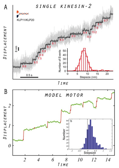 Examples of motor operation: (A) Stepwise processive transport by a kinesin-2 motor observed in single-molecule assays under saturating ATP concentrations. The stepsize distribution is also shown. The figure is taken from Reference [31]. (B) An example trace of filament transport by the designed in silico model motor, and the stepsize distribution obtained from the analysis of 1000 operation cycles (adapted from Reference [22] with modifications).