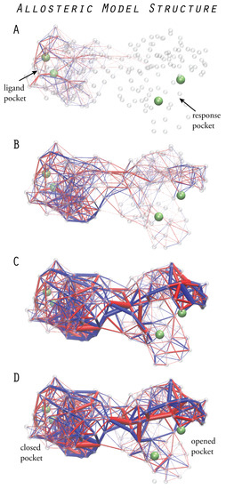 Designed allosteric structure. Prototype elastic network structure with an asymmetric allosteric response. The propagation of strain, shown at different moments of time after ligand binding (A–D), reveals communication pathways which couple the dynamics of the remote pockets (snapshots adopted from Reference [20]).