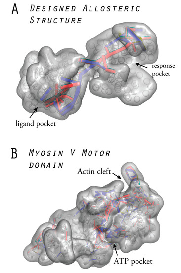 Figure 6 displays a designed allosteric structure obtained from our computational evolution model, together with the naturally evolved myosin V motor domain. In both structures, the identified communication pathways are highlighted. In fact, the two designed network architectures can be regarded as coarse-grained representations of fictitious, allosterically functional protein structures. We elaborate on such aspects further in Section 7.