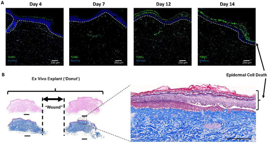 Tissue viability in the 4 mm punch wound pilot study. (A) Ex vivo untreated control samples were harvested at the stated time points, sectioned, and stained for cellular death by TUNEL (green staining). A significant increase in terminal deoxynucleotidyl transferase dUTP nick-end labeling (TUNEL) staining was evident in the epidermis over time (white dotted line designates the bottom of the epidermis). (B) Representative hematoxylin and eosin (H&E) (left side upper 2 sections) and Masson’s Trichrome (MTC, left side lower 2 sections) staining of day 14 untreated explant cut directly through the center of the donut resulting in 2 pieces with the edges of the wound represented by dotted lines. Scale bars equal 1 mm. Enlarged MTC image to the right indicates similar epidermal cytotoxicity that is observed in the TUNEL staining above. Scale bar equals 250 µm.