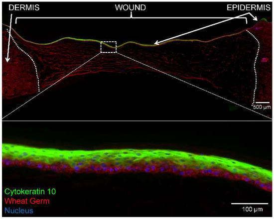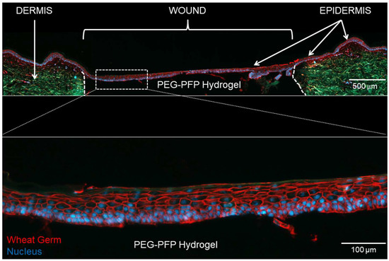 Immunofluorescence of epidermal stratification on day 14 explants treated with PEG-PFP. (Top) CK-10 (green) stained the suprabasal layer of cells indicating formation of a stratified epidermis. Sections were counterstained with WG (red) to show the entire newly formed epidermis Nuclei (blue) are observed throughout the PEG-PFP hydrogel-treated area. The white dotted line represents the boundary from the normal dermis and the wound treated with PEG-PFP. (Bottom) Enlarged view of white boxed region with a better visual representation of the stratified epidermis from the center of the wound.