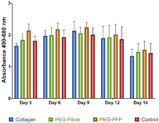 Three different biomaterials: collagen, PEG-fibrin, and PEG-PFP were used as treatments to fill the wound in 8 mm ex vivo explants. The samples were cultured for 14 days with the media collected and changed every 3 days. Tissue viability was assessed by the lactate dehydrogenase (LDH) assay. No differences in LDH activity were measured at any time point comparing all treatment groups including control (untreated) wounds (Figure 3). A slight decrease in the overall LDH activity was observed at the day 14 time point but was not statistically significant.