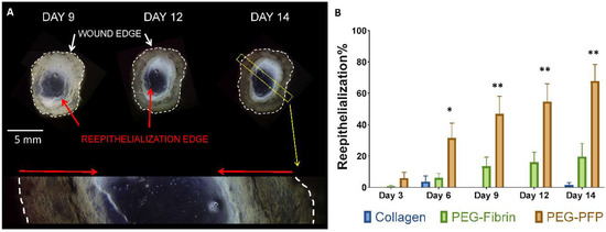 Microscopy images were captured at all time points so that the wound closure or re-epithelialization rates could be determined. Figure 4A shows a PEG-PFP hydrogel treated wound at days 9, 12, and 14. The advancing epithelial edge is clearly observed in the digital images with the open area decreasing over time. The enlarged image of day 14 explant (Figure 4A bottom) definitively shows the advancing epithelium, indicated by the red arrows. Significant differences in the re-epithelialization rates were observed comparing the 3 different biomaterials as depicted in Figure 4B. PEG-PFP treated wounds closed at a faster rate than all other wounds from days 6 to 14. (Day 14: 67.8 ± 10.6% vs. 19.6 ± 8.4% vs. 1.6 ± 1.6% for PEG-PFP, PEG-fibrin, and collagen respectively, p < 0.0001). While the PEG-fibrin appeared to a better biomaterial than collagen in promoting wound closure at day 14, it was not found to be significant (p = 0.0626).
