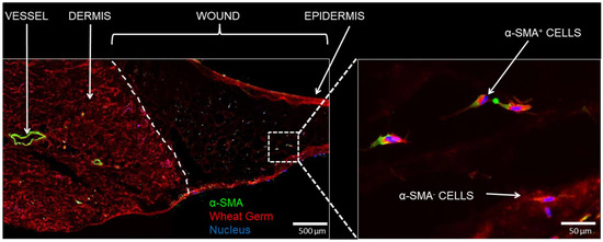 Immunofluorescence of cellular infiltration. (Left) day 14 sections treated with PEG-PFP were stained with α-smooth muscle actin (α-SMA, green), a blood vessel and mesenchymal stem cell/myofibroblast marker, and counterstained with WG (red). The white dotted line represents the boundary between normal dermis and the wound treated with PEG-PFP. (Right) Enlarged view of white boxed region that shows cells from the normal tissue have infiltrated and proliferated into the hydrogel. Both α-SMA positive and negative stained cells were observed.