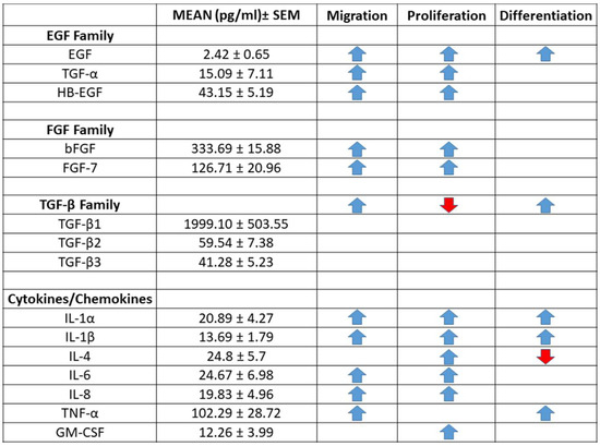 Quantification of cytokines, chemokines, and growth factors in human platelet-free plasma. Analysis of 200 proteins from three patient samples by Q4000 Quantibody® revealed detectable levels of 176 proteins. A selection of proteins and growth factors related to migration, proliferation, and differentiation of keratinocytes are presented as mean ± standard error of the mean (SEM) in pg/mL. Arrow direction, increases (blue) or decreases (red), indicates the effect of the particular protein on either migration, proliferation, and/or differentiation of keratinocytes as reviewed in the literature [36,37,38].