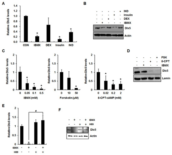 Because our previous study demonstrated that an adipogenesis induction mixture suppresses Dlx5 expression [4], we first examined the effect of each component of the induction mix on the expression of Dlx5. 3T3-L1 cells were incubated for 24 h in the presence of each adipogenic component (0.5 mM IBMX, 0.1 µM dexamethasone, 10 µg/mL insulin, or 50 µM indomethacin), and qRT-PCR and Western blot analyses were performed to detect Dlx5 mRNA and protein expression, respectively. Consistent with the results from a previous report [5], insulin strongly suppressed Dlx5 expression (Figure 1A,B). In addition, IBMX significantly downregulated Dlx5 mRNA and protein expression levels (Figure 1A,B). Therefore, we more closely examined the effect of IBMX on Dlx5 expression in this study.